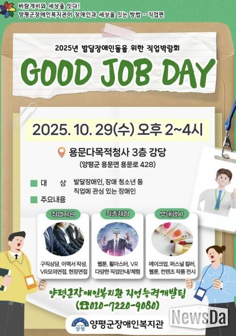뉴스다 최광묵 기자 | 대한불교조계종사회복지재단이 운영하는 양평군장애인복지관은 오는 29일 오후 2시부터 4시까지 용문다목적청사 3층 강당에서 발달장애인의 직업 탐색 기회를 지원하기 위한 직업박람회 ‘GOOD JOB DAY’를 개최한다.