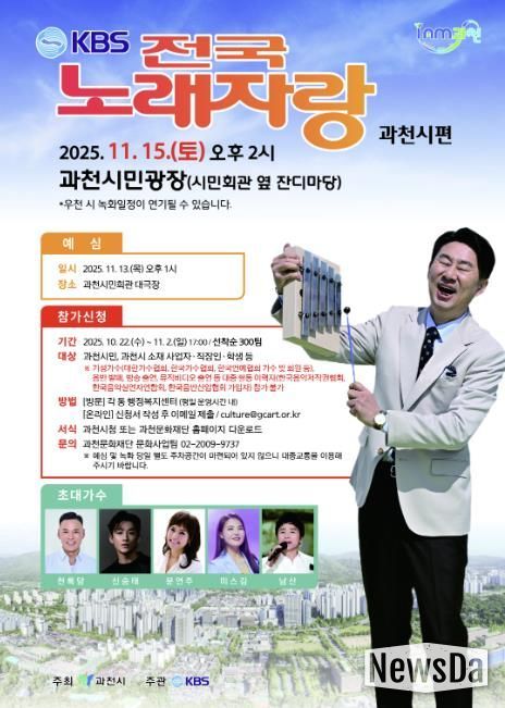 뉴스다 최광묵 기자 | 과천시는 대한민국 대표 장수 프로그램 KBS1TV ‘전국노래자랑’이 오는 11월 15일, 과천시민광장에서 공개녹화를 진행한다고 밝혔다. 이번 행사는 7년 만에 과천에서 열려, 시민들에게 특별한 추억을 선사할 것으로 기대된다.