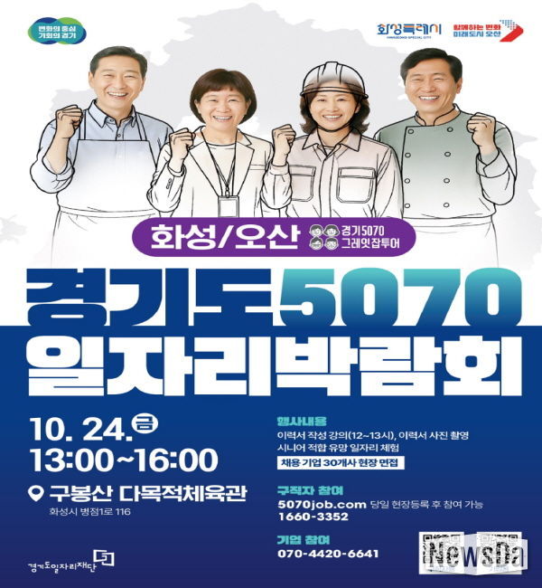 뉴스다 최광묵 기자 | 경기도와 경기도일자리재단은 오는 10월 24일, 구봉산 다목적체육관에서 중장년층을 위한 『2025 경기도 5070 일자리박람회 in 화성+오산』를 개최한다고 밝혔다.