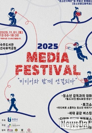 뉴스다 최광묵 기자 | 부천시와 고리울청소년센터가 주관하는 ‘2025 미디어 페스티벌’이 오는 11월 1일 오후 1시부터 6시까지 수주도서관과 선사유적공원에서 개최된다. 이번 축제는 청소년기획단이 주체가되어 직접 기획하고 준비하여 진행하며, ‘미디어와 함께 연결되다’를 주제로, 사람-사람, 사람-기술이 미디어를 통해 함께 소통하고 공감하는 장을 마련했다.