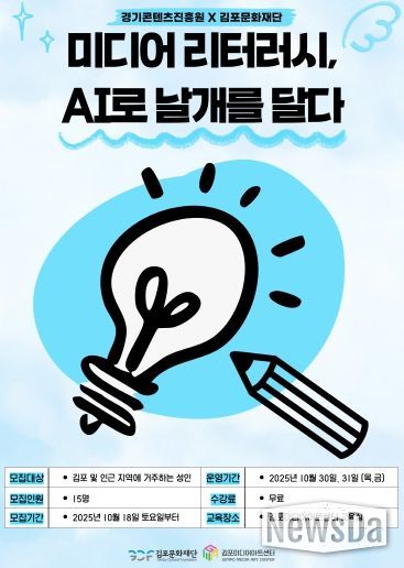 뉴스다 최광묵 기자 | (재)김포문화재단과 경기콘텐츠진흥원은 오는 10월 30일과 31일, 양일간 김포미디어아트센터 교육실에서 '미디어리터러시, AI로 날개를 달다' 디지털 리터러시 및 AI 활용 교육을 공동 개최한다고 밝혔다.