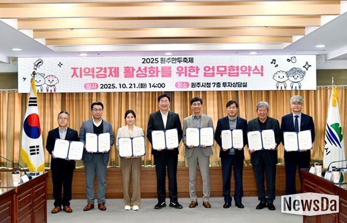 뉴스다 최광묵 기자 | 원주시는 오는 24일부터 26일까지 열리는 ‘2025 원주만두축제’의 성공적 개최와 지역 상권 활성화를 위해, 21일 시청에서 ‘지역경제 활성화를 위한 업무협약’을 체결했다.