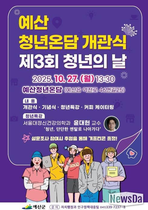 뉴스다 최광묵 기자 | 예산군은 오는 10월 27일 오후 1시 30분, 예산읍 주교리에 위치한 청년거점공간 ‘예산청년온담’에서 개관식과 제3회 청년의 날 기념행사를 개최한다고 밝혔다.