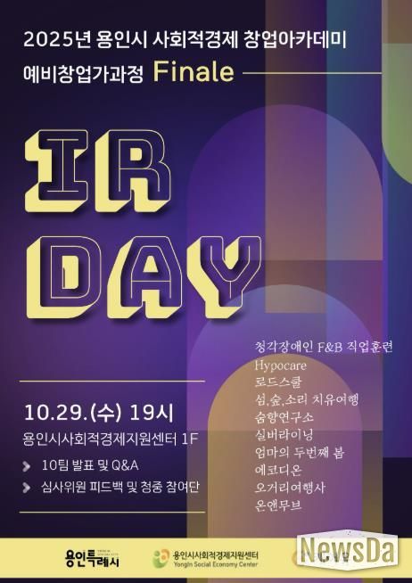 뉴스다 최광묵 기자 | 용인특례시는 오는 29일 열리는 ‘사회적경제 창업아카데미 파이널 IR 데모데이’에 참가할 ‘청중평가단’을 모집한다고 22일 밝혔다.