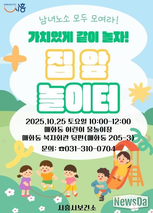 뉴스다 최광묵 기자 | 시흥시는 오는 10월 25일 오전 10시부터 12시까지 매화동 어린이 물놀이장(매화동 복지회관 뒤편(매화동 205-3))에서 ‘집앞 놀이터’ 프로그램을 운영한다.
