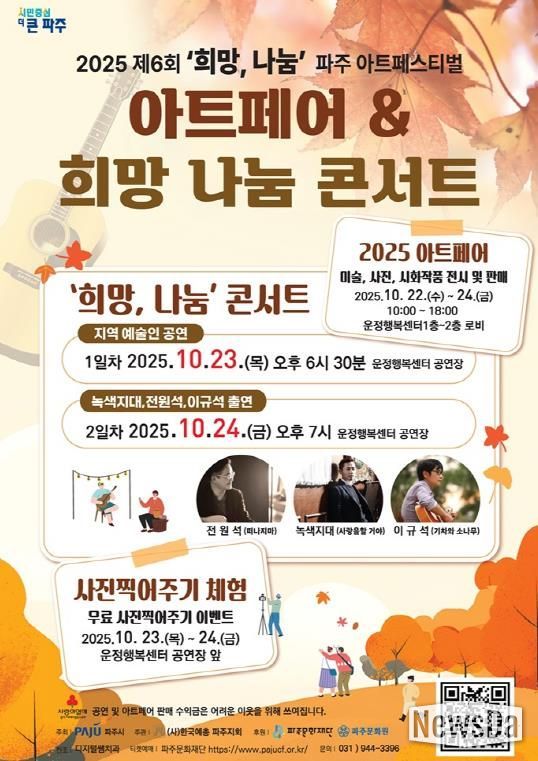 뉴스다 최광묵 기자 | 파주시가 주최하고 ㈔한국예술문화단체총연합회 파주지회에서 주관하는 '2025 제6회 ‘희망, 나눔’ 파주 아트페스티벌'이 10월 22일부터 24일까지 3일간 운정행복센터에서 개최된다.