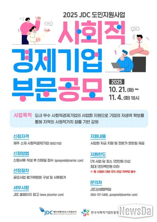 뉴스다 최광묵 기자 | 제주국제자유도시개발센터는 제주 지역의 사회적가치 창출 기반 강화를 위한 ‘2025년 도민지원사업 사회적경제기업 부문 공모’를 오는 11월 4일까지 실시한다고 밝혔다.