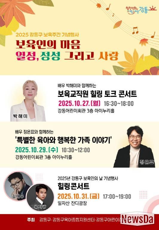 뉴스다 최광묵 기자 | 강동구는 10월 보육주간을 맞아 강동구육아종합지원센터와 함께 보육 현장에서 애쓰는 보육교직원을 응원하고, 부모들과 실질적인 육아 경험을 나누는 ‘힐링 토크 콘서트 및 부모특강’을 개최한다고 22일 밝혔다.