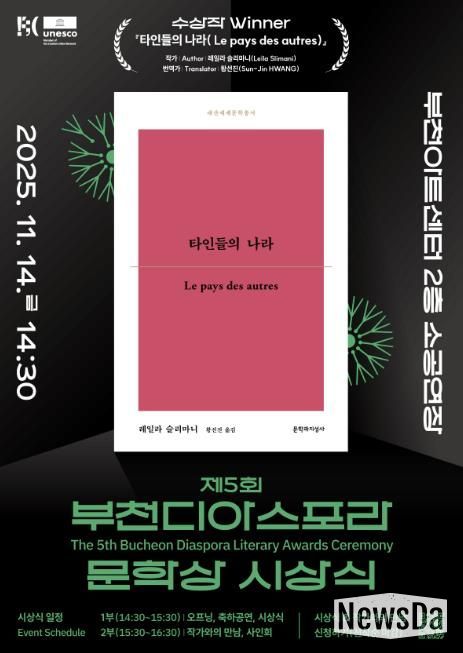 뉴스다 최광묵 기자 | 부천시는 11월 14일 부천아트센터에서 열리는 ‘2025년 제5회 부천디아스포라문학상’ 시상식을 앞두고, 수상작으로 레일라 슬리마니 작가의 ‘타인들의 나라(Le pays des autres)’를 선정했다고 22일 밝혔다.