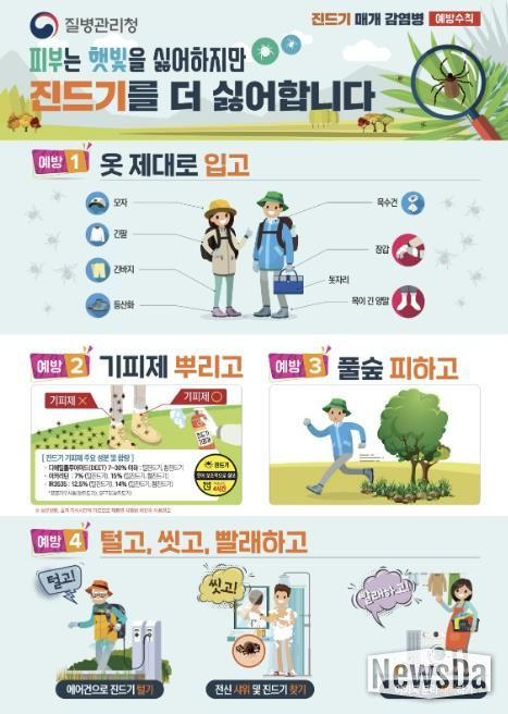 아울러, 야외활동 후 2주 이내에 발열, 두통, 구토, 설사 등 증상이 나타날 경우에는 지체하지 말고 즉시 의료기관을 방문해 진료를 받을 것을 강조했다.