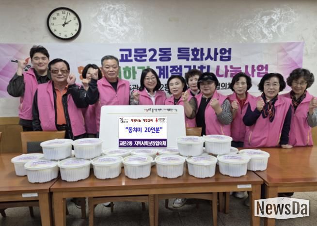 한편, ‘행복 더하기 계절 김치 나눔 사업’은 2023년부터 매년 이어지고 있는 교문2동 지역사회 보장협의체의 대표 복지 특화사업으로, 계절별로 맞춤형 김치를 담가 관내 취약계층에 전달해 큰 호응을 얻고 있다. 협의체는 올겨울에도‘겨울 계절 김치 나눔’을 추진해 지역 내 소외된 이웃들에게 따뜻한 마음을 전할 예정이다.