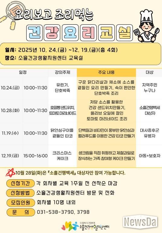 수업은 소흘건강생활지원센터 교육실에서 회차별 10명 내외 소수 정원으로 진행해 참가자가 직접 조리하는 체험 중심 실습 환경을 제공한다. 교육 내용은 저염 식단과 고혈압·당뇨 예방 식단 설계, 저당 소스를 활용한 건강식 조리, 단백질·비타민이 풍부한 균형 식단 구성, 가족 참여형 크리스마스 케이크 만들기 등을 다룬다.