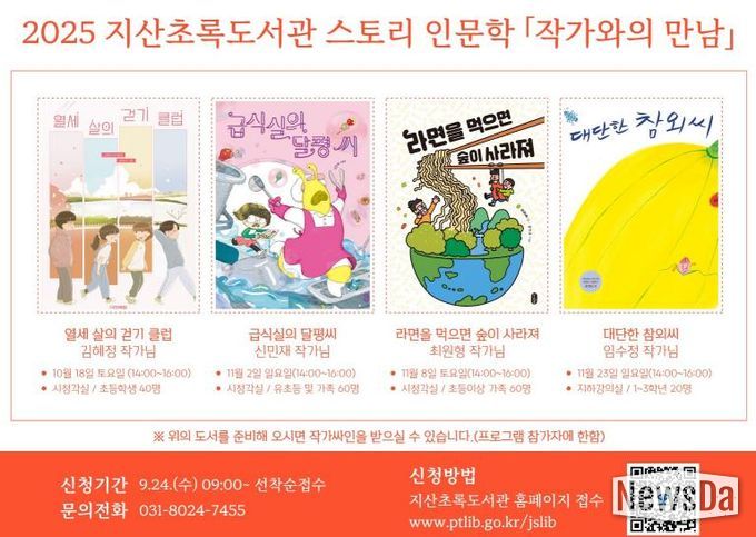 이번 프로그램은 전 세대가 함께 즐길 수 있는 독서 인문학의 장으로, 프로그램 관련 문의는 지산초록도서관(031-8024-7455)으로 가능하다. (사전접수 마감) 도서관 관계자는 “지역 어린이들이 작가와의 만남을 통해 책의 세계를 한층 깊이 느끼고 창의적인 영감을 얻는 계기가 되길 바란다”라고 전했다.