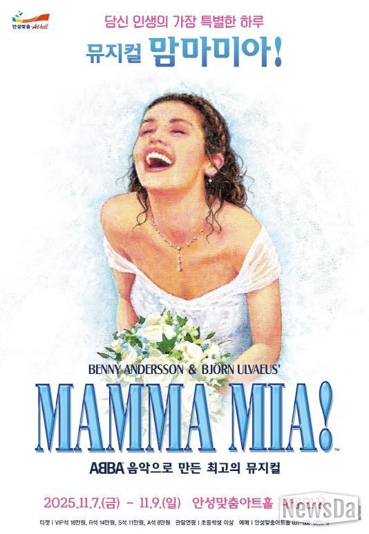 뉴스다 최광묵 기자 | 안성맞춤아트홀은 오는 11월 7일부터 9일까지 대공연장에서 세계적인 히트 뮤지컬 '맘마미아!'를 무대에 올린다. 세대를 초월한 명곡과 유쾌한 스토리로 사랑받아온 이번 작품은 남녀노소 누구나 즐길 수 있는 최고의 힐링 뮤지컬이다.