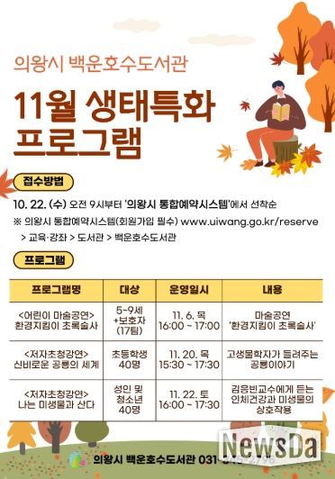 뉴스다 최광묵 기자 | 의왕시 백운호수도서관은 지역 주민들에게 자연과 생태의 소중함을 알리고 책을 통해 환경 감수성을 높이기 위해 '11월 생태특화 프로그램'을 운영한다고 밝혔다.