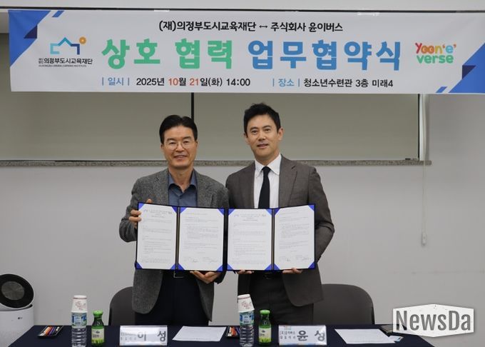 뉴스다 최광묵 기자 | (재)의정부도시교육재단은 지난 10월 21일 ㈜윤이버스와 ‘AI 기반 영어학습 협력 기반 구축을 위한 업무협약’을 체결했다.