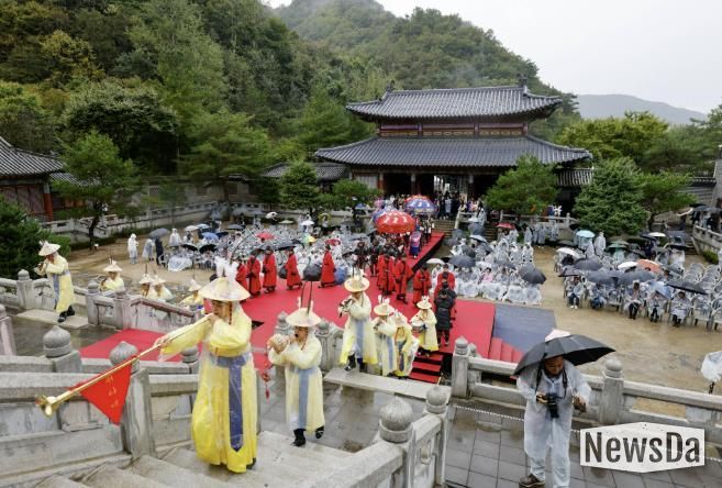 드라마 세트장처럼 꾸며진 황궁 앞 거리에는 관람객과 관계자가 나란히 도열하고 그 사이로 북소리를 울리며 군사와 군마 행렬이 지나가며 거대한 야외 연극장을 연출한다.