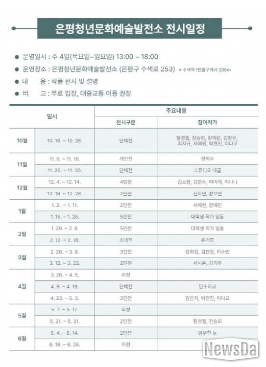 전시는 은평청년문화예술발전소에서 매주 목요일부터 일요일, 오후 1시부터 6시까지 진행되며, 방문객들은 누구나 자유롭게 관람할 수 있다. 특히 매달 2~3회 전시회가 변경돼 새로운 작품들이 계속해서 선보일 예정이니, 은평구민들의 많은 관심과 방문을 바란다.