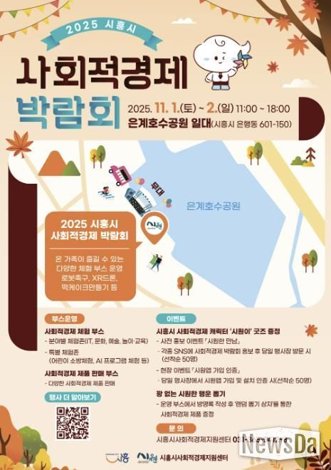 뉴스다 최광묵 기자 | 시흥시는 오는 11월 1일과 2일, 오전 11시부터 오후 6시까지 은계호수공원 일대에서 ‘2025년 시흥시 사회적경제 박람회’를 개최한다.