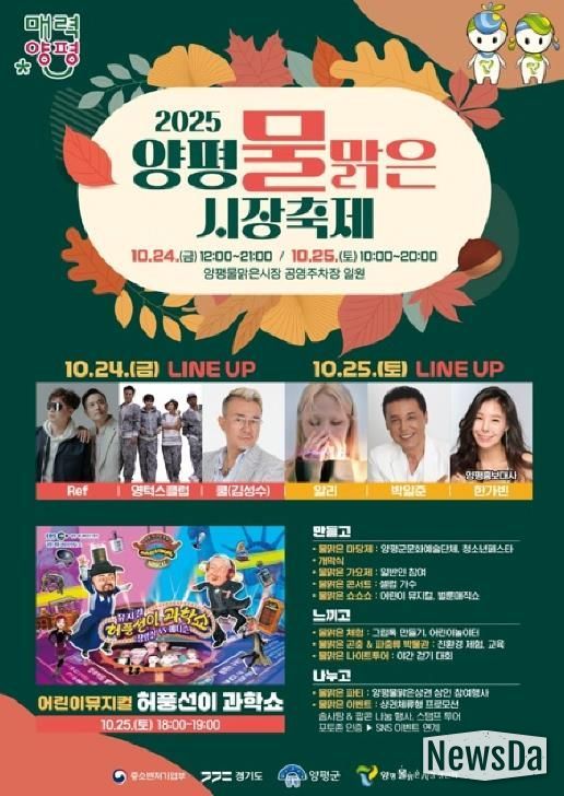 뉴스다 최광묵 기자 | 양평물맑은시장의 대표 축제인 ‘2025 양평물맑은시장 축제’가 오는 10월 24일부터 25일까지 양평물맑은시장 공영주차장에서 열린다.