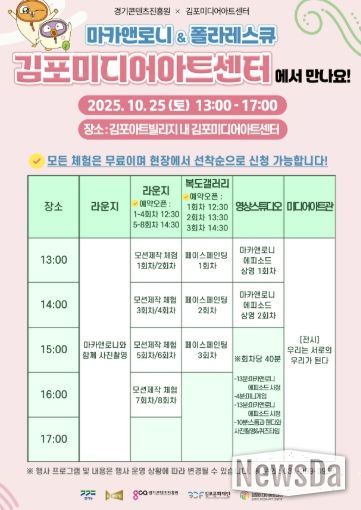 이번 행사는 사전 신청 없이 누구나 무료로 참여할 수 있으며, 자세한 사항은 김포문화재단 홈페이지를 참고하거나 김포미디어아트센터팀에 문의하면 된다.