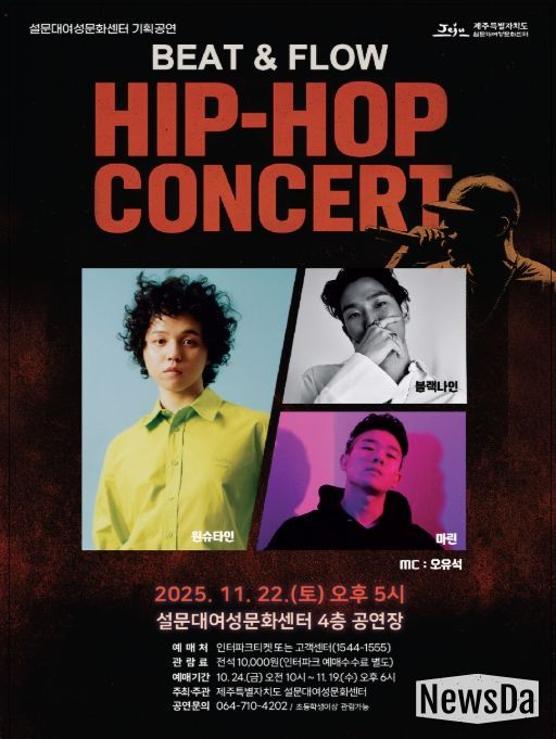 뉴스다 최광묵 기자 | 제주특별자치도 설문대여성문화센터는 ‘설문대 문화의 날’ 11월 기획공연으로 ‘원슈타인·블랙나인·마린 힙합콘서트’를 11월 22일 오후 5시에 공연장에서 선보인다고 밝혔다.