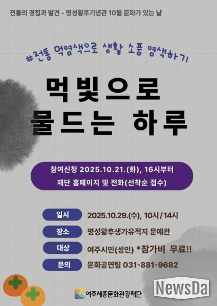 뉴스다 최광묵 기자 | 여주세종문화관광재단은 오는 10월 29일, 명성황후기념관 10월 문화가 있는 날 프로그램으로‘먹빛으로 물드는 하루’를 진행한다.