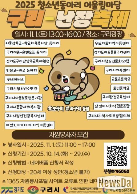 뉴스다 최광묵 기자 | 구리시청소년재단 청소년수련관은 오는 11월 1일 오후 1시부터 4시까지 구리광장에서‘2025 청소년동아리 어울림마당(구리-난장 축제)’을 개최한다. 이번 축제는 구리 지역 아동 청소년 네트워크 공동사업으로 추진되며, 청소년과 시민이 함께 즐길 수 있는 다양한 체험과 공연 프로그램이 마련되어 있다.