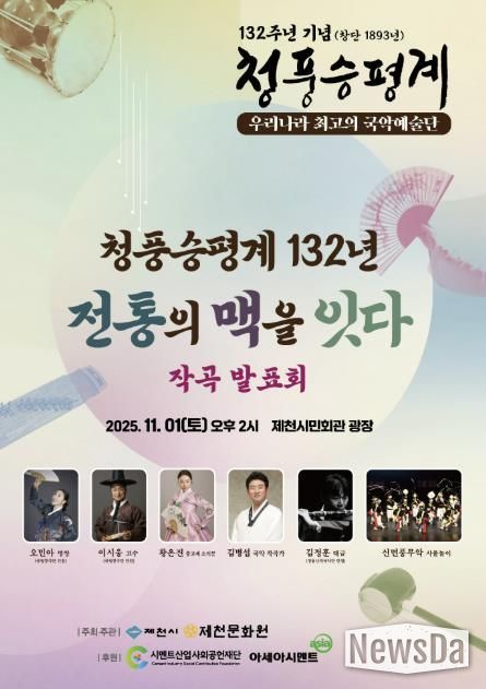 뉴스다 최광묵 기자 | 우리나라 최고의 국악예술단으로 평가받는 청풍승평계(1893년 창단)의 음악적 정신을 기리는 『헌정곡』이 처음으로 제작됐다. 제천문화원은 오는 11월 1일 오후 2시 제천시민회관 광장에서 『청풍승평계 132주년 기념 작곡 발표회』를 개최한다고 29일 밝혔다. 이번 발표회는 ‘132년 전통의 맥을 잇다’를 주제로 악성 우륵의 예맥을 계승하고 청풍승평계의 음악적 가치와 예술혼을 되새기는 무대로 마련됐다.