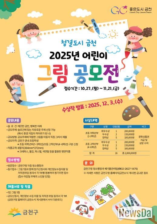 뉴스다 최광묵 기자 | 금천구는 10월 27일부터 11월 21일까지 ‘청결도시 금천 어린이 그림 공모전’을 개최한다고 밝혔다.