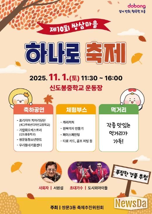 뉴스다 최광묵 기자 | 서울 도봉구 쌍문3동이 오는 11월 1일 신도봉중학교 운동장에서 ‘제10회 쌍삼마을 하나로 축제’를 개최한다.
