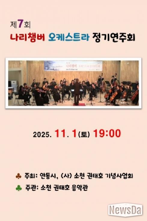 뉴스다 최광묵 기자 | (사)소천권태호선생기념사업회가 주최․주관하는 ‘제7회 나리챔버오케스트라 정기연주회’가 11월 1일 오후 7시, 안동시 소천권태호음악관 실내 연주홀에서 개최된다.