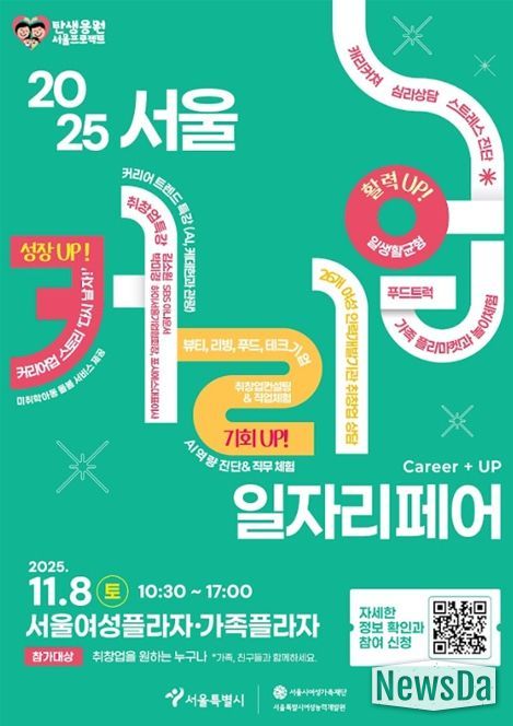 뉴스다 최광묵 기자 | 서울시가 주최하고 서울시여성가족재단과 서울여성능력개발원이 주관하는'2025 서울커리업 일자리페어'가 11월 8일 오전 10시 30분부터 오후 5시까지, 대방동 서울여성플라자와 서울가족플라자 일대에서 열린다.