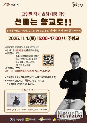 뉴스다 최광묵 기자 | 전라남도 나주시가 유교의 정신과 현대인의 공감 가치를 주제로 한 인문 강연 ‘선비는 향교로!’를 나주향교에서 개최한다.