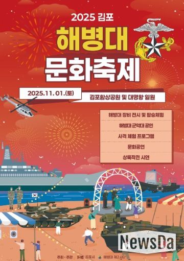 뉴스다 최광묵 기자 | 해병대 문화 체험을 한 자리에서 즐길 수 있는 ‘2025 김포 해병대 문화축제’가 오는 11월 1일 김포 함상공원과 대명항 일원에서 열린다. 올해로 2회째를 맞는 이번 축제는 접경지역이라는 김포의 특색을 살려 안보와 문화를 융합한 체험형 축제로, 한층 더 업그레이드된 프로그램으로 관람객을 맞이할 예정이다.