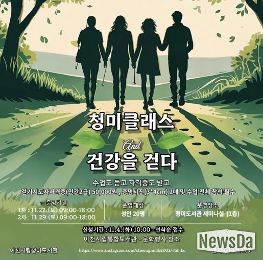 뉴스다 최광묵 기자 | 이천시 청미도서관은 오는 11월 22일과 29일, 성인을 대상으로 ‘청미클래스, 건강을 걷다’ 프로그램을 운영한다.