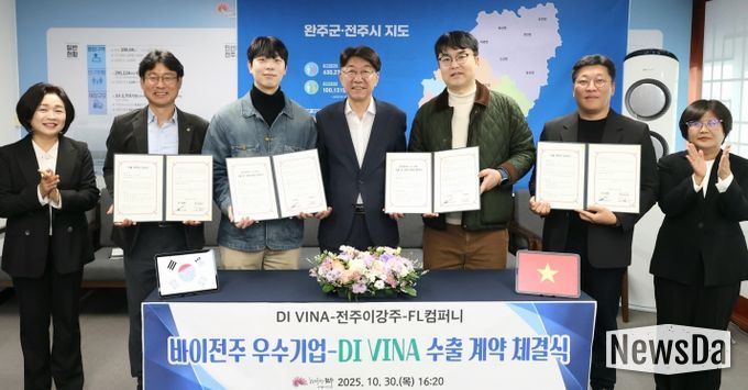 시는 30일 전주시장실에서 우범기 전주시장과 김완엽 DI VINA 대표, 바이전주 우수기업 대표 등이 참석한 가운데 ‘바이전주 우수업체-DI VINA 수출계약 체결식’을 가졌다.