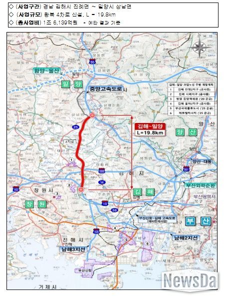 ➊김해~밀양 고속도로 신설은 경남 김해시 진례면 ~ 밀양시 상남면 19.8㎞ 구간 왕복 4차로를 신설하는 사업(총사업비 1.6조원)으로, 부산항신항 및 가덕도신공항의 접근성을 제고하고 대구·경남 지역 산업단지 물류 경쟁력 강화에 기여할 것으로 기대된다.