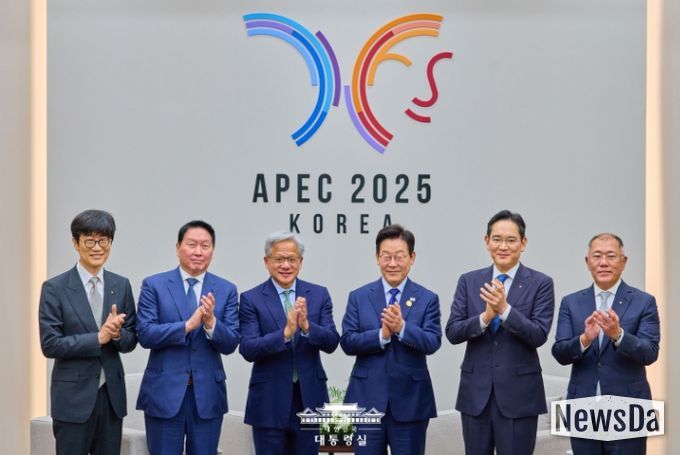 뉴스다 최광묵 기자 | 이재명 대통령은 10월 31일 오후 2시 경주 APEC 정상회의를 계기로 방한한 젠슨 황 엔비디아 대표를 만나, 대한민국 AI 인프라를 비롯한 생태계 전반의 혁신 방안에 대해 의견을 교환했다. 이 자리에는 삼성전자 이재용 회장, SK 최태원 회장, 현대차그룹 정의선 회장, 네이버 이해진 의장이 함께했다.