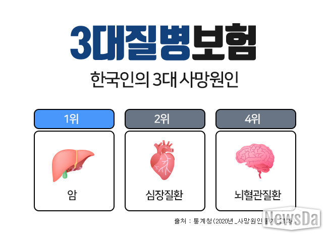 뉴스다 최광묵 기자 | 흔히 3대질병이라 일컫는 암, 심혈관질환, 뇌혈관질환은 통계청 발표자료에 따르면 한국인의 주요 사망원인 중에서 3위 폐렴을 제외하고 1~4위를 차지하고 있으며, 이전부터 지금까지도 살면서 가장 먼저 대비해야 하는 치명적인 질병으로 강조되고 있다. 이러한 중대질병에 대비하기 위하여 상기 세가지 치명적인 질병을 집중보장하는 3대질병진단비보험을 많이 가입하고 있다. 3대진단비보험은 각각의 질병을 중점적으로 보장하면서도 가입자 특성에 맞는 특약을 추가함으로써 종합건강보험으로도 활용할 수가 있다.