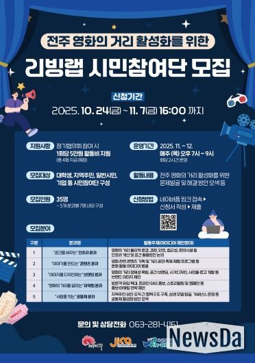 뉴스다 최광묵 기자 | 전주정보문화산업진흥원(원장 허전)과 우석대학교(총장 박노준)는 전북 RISE 1차 공모사업의 일환으로 ‘전주 영화의 거리 활성화를 위한 리빙랩’의 시민참여단을 모집한다고 밝혔다.