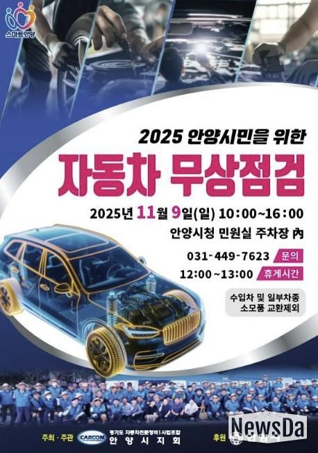 뉴스다 최광묵 기자 | 안양시는 오는 9일 오전 10시부터 오후 4시까지 안양시청 민원실 주차장에서 시민들의 안전한 차량 운행과 자동차 관리를 돕기 위한 ‘자동차 무상 안전점검’을 실시한다고 3일 밝혔다.