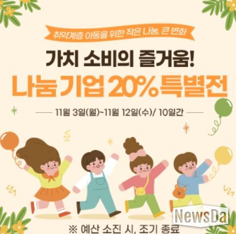 행사 동안 나눔 기업 상품에 대해 20% 할인을 지원하며, 소비자는 1인당 2매, 1매당 최대 5만 원 할인 쿠폰을 활용할 수 있다. 나눔 기업 특별전은 예산 소진 시 조기 종료될 예정이다.
