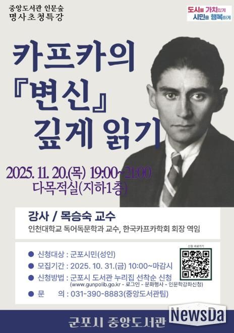 뉴스다 최광묵 기자 | 군포시 중앙도서관은 2025년 하반기'중앙도서관 인문숲'명사 초청 특강의 세 번째 무대로 오는 11월 20일 저녁 7시부터 9시까지 중앙도서관 지하 1층 다목적실에서 인천대학교 독어독문학과 목승숙 교수를 초청해 '카프카의 [변신] 깊게 읽기' 특강을 진행한다.