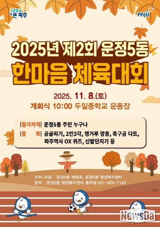 뉴스다 최광묵 기자 | 파주시 운정5동은 오는 11월 8일 토요일 두일중학교에서 녩년 제2회 한마음 체육대회’를 개최한다.