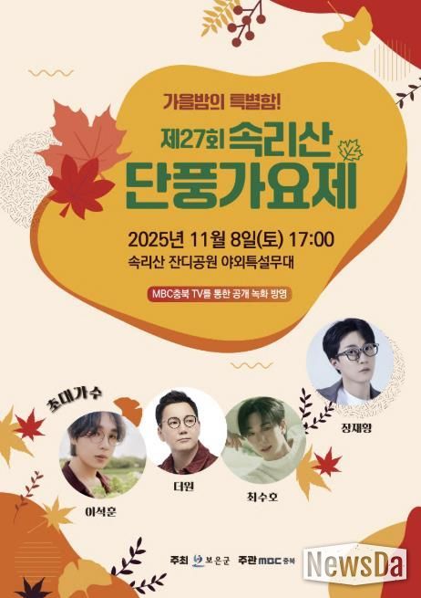 이혜영 문화관광과장은 “가을 정취 가득한 속리산에서 열리는 단풍가요제는 매년 큰 사랑을 받고 있다”며 “많은 분들이 함께해 속리산의 아름다운 가을과 수준 높은 공연을 즐기시길 바란다”고 말했다.