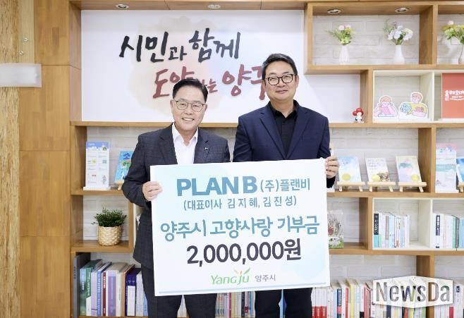뉴스다 최광묵 기자 | ㈜플랜비가 5일 오전 양주시에 지역 발전을 위해 고향사랑기부금 200만 원을 전달했다.