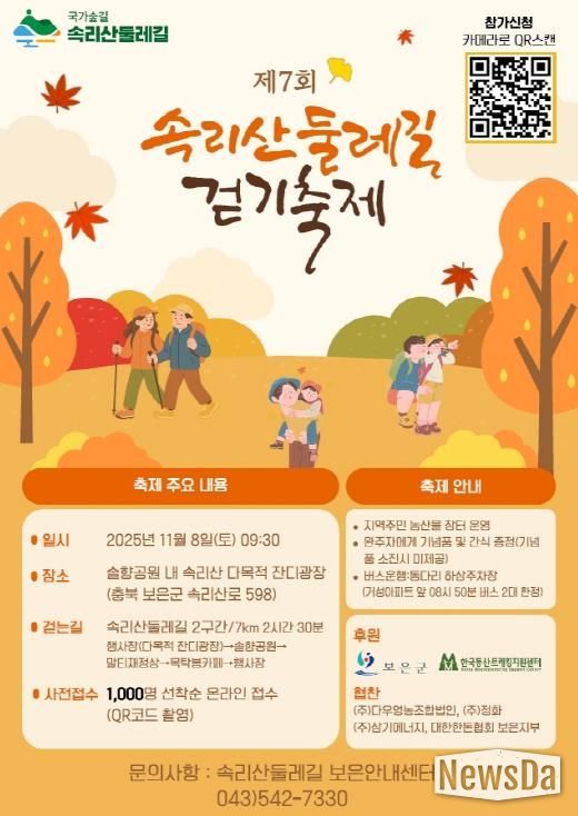 뉴스다 최광묵 기자 | 보은군은 ‘제7회 속리산 둘레길 걷기 축제’가 오는 8일 보은군 속리산면 솔향공원 내 다목적 잔디광장 일원에서 열린다고 밝혔다.