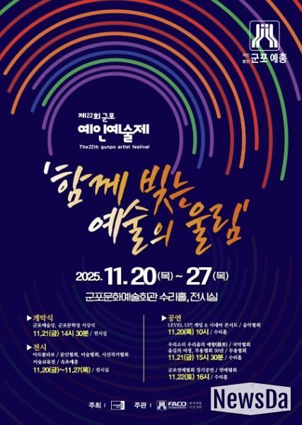 뉴스다 최광묵 기자 | 2025년 제22회 군포 예인예술제가 11월 20일부터 27일까지 군포문화예술회관 전시실과 수리홀에서 8일간 진행된다.