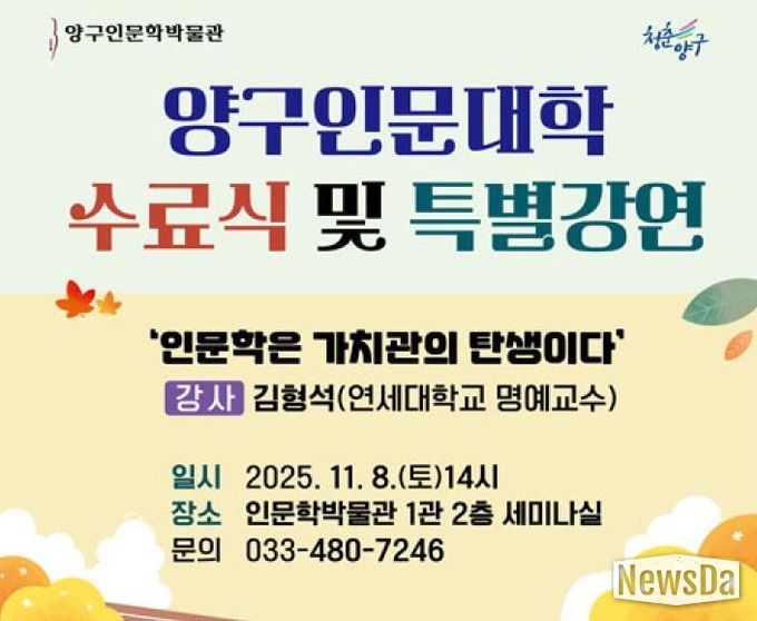 뉴스다 최광묵 기자 | 양구군은 8일 양구인문학박물관 세미나실에서 인문대학 수료식 및 특별강연을 진행한다.